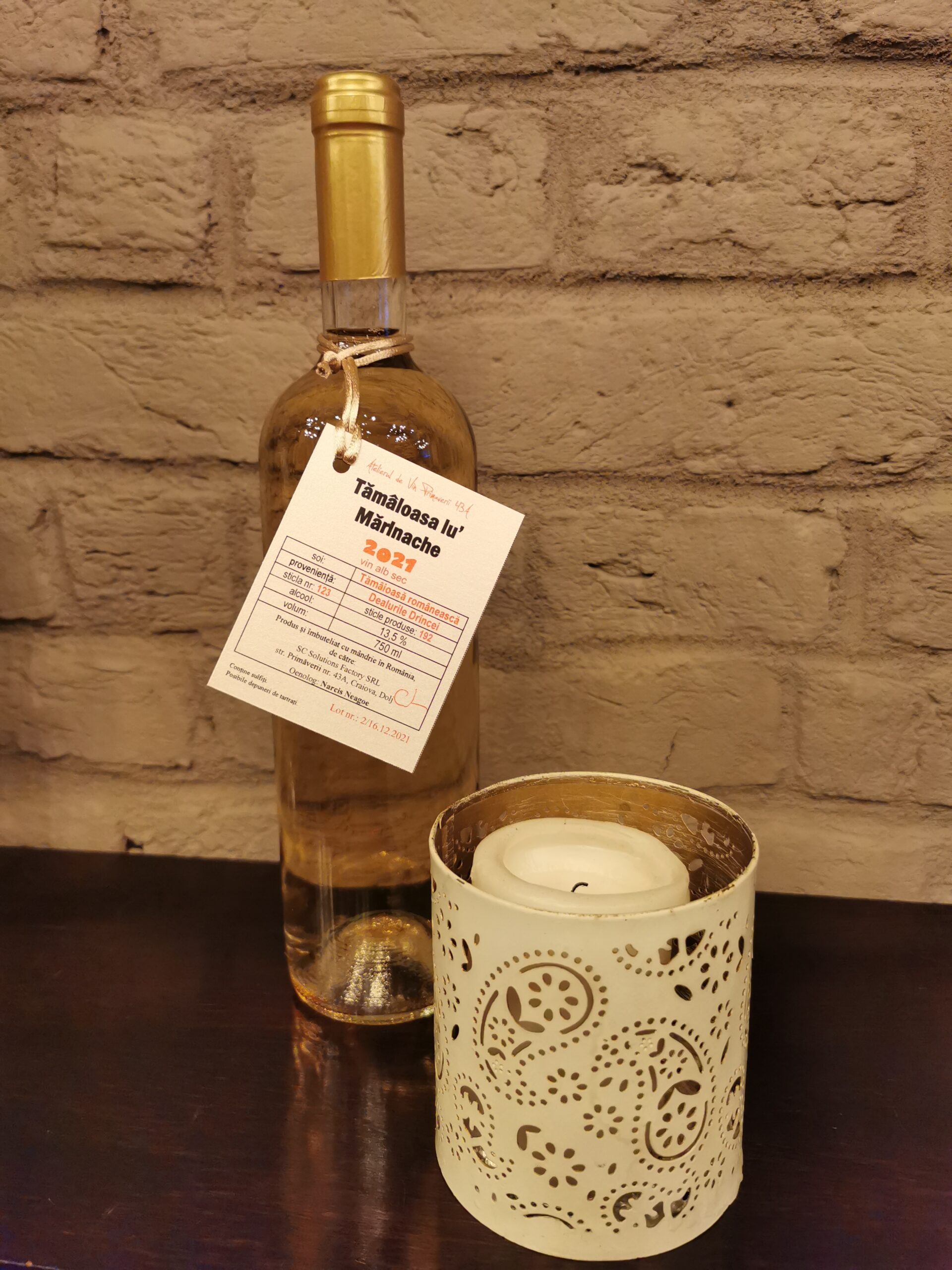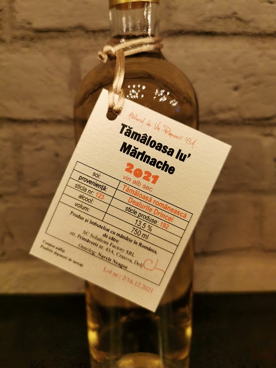 Crâmpoșie + Muscat Ottonel din Drăgășani, vin alb sec, 14,3 % vol. alc., 0,17 g/l rest de zahar, 4,94 g/l aciditate totală (exprimată în acid tartric), 160 de sticle produse